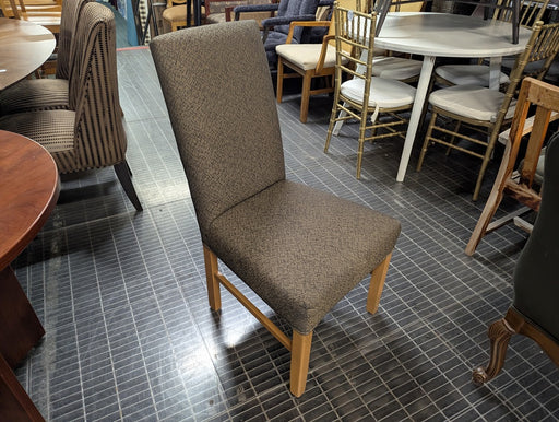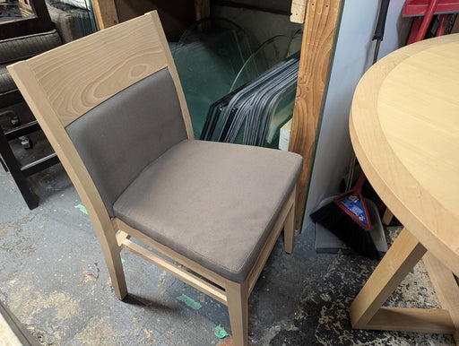 Light wood dining chair with grey upholstery. Good for home dining or restaurant seating. Matching Round Dining Table available also.