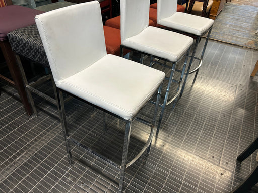 White Bar stool with metal legs and chair back. Bar Height. Dimensions: 17"L x 17"W x 40"H